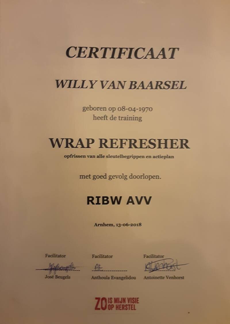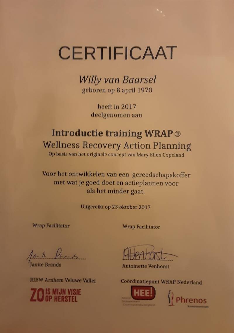 Jippie, na een intense 5-daagse training ben ik nu co facilitator voor de WRAP® cursus. Ik ga deze met een collega in mijn stagejaar geven. Ik ben zo trots en verguld, heb echt het gevoel een Vierdaagse -1997- gelopen te hebben, wow. Ook in Nijmegen.