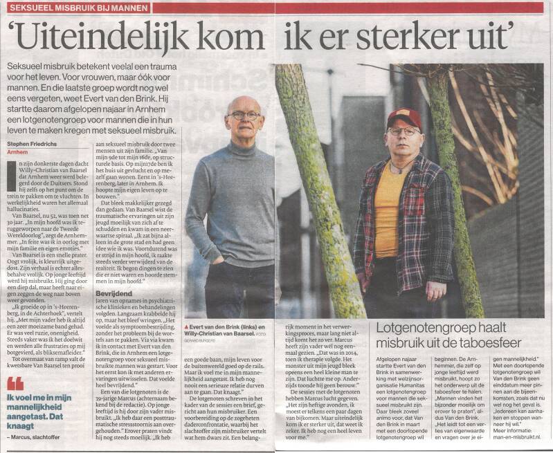 weet Evert van den Brink. Hij startte daarom afgelopen najaar in Arnhem een lotgenotengroep voor mannen die te maken kregen met seksueel misbruik.